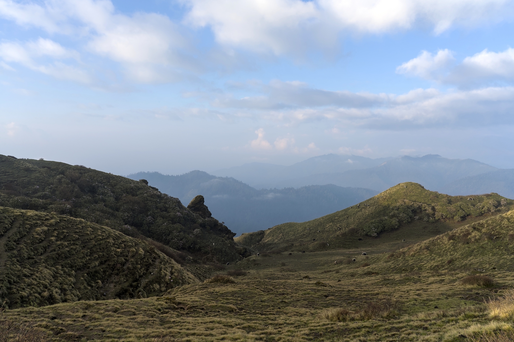Next you will begin a steady but manageable trek uphill, passing the villages of Meshar Danda and Ishuru along the way, one of which you will enjoy lunch at. After passing these villages, the tree canopy begins to open up a bit, giving way to lush grasslands, flowery meadows, and beautiful mountain streams.